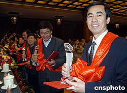 由中國新聞技術工作者聯合會主持的首屆王選新聞科學技術獎一月六日在北京舉行頒獎大會,這是中國新聞界第一個全國性跨媒體的科學技術獎項。圖為中國新聞社技術部工程師林道進與其他獲獎代表領獎。中新社記者:張宇