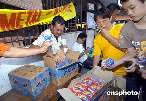1月7日,在印度尼西亞棉蘭市的難民避難所內,遭受海嘯災難影響的班達亞齊災民分享華族團體送來的賑災食品。作者:洪少葵