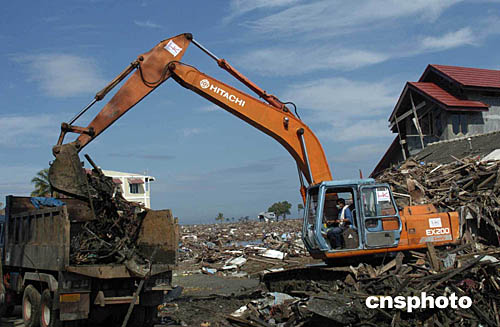 1月9日, 班達(dá)亞齊西部的洛阿村到市區(qū),清理廢墟的工作已經(jīng)加快。從洛阿村到市區(qū)的路上,一輛輛挖土機(jī)和鏟土機(jī)正在緊張地作業(yè),將破磚破木板以及雜物鏟到運(yùn)輸車(chē)上。據(jù)醫(yī)療部門(mén)人士說(shuō),災(zāi)難已經(jīng)過(guò)去十五日,如果不再及時(shí)清理死尸,很有可能爆發(fā)瘟疫。