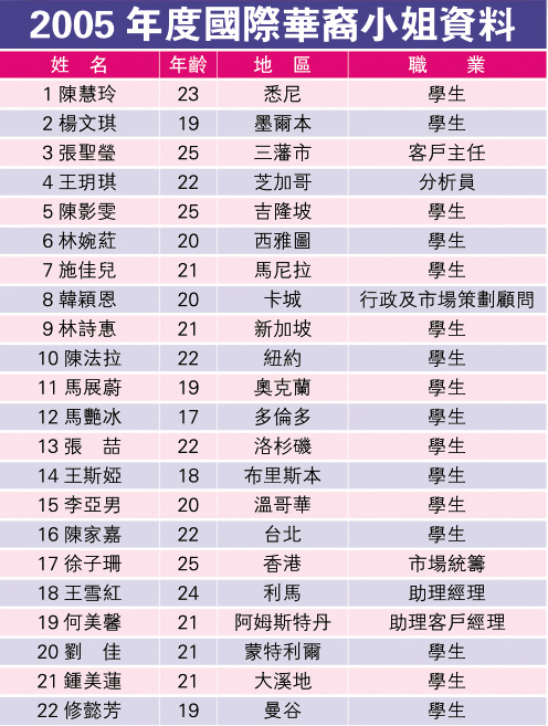 綜觀今屆候選佳麗,除青春之外,學(xué)歷更佳,過(guò)半數(shù)是大學(xué)生,甚至有碩士學(xué)歷,惟質(zhì)素就較為平庸,雖然經(jīng)過(guò)大會(huì)悉心打扮,但昨日所見,未有突出者。佳麗之中,暫時(shí)以選美經(jīng)驗(yàn)豐富、曾是“2003MissChinaTown(USA)”第二名及紐約華裔小姐第一名的十號(hào)陳法拉樣子較為甜美。而來(lái)自三藩市的三號(hào)佳麗張圣瑩和來(lái)自布里斯本的十四號(hào)佳麗王斯婭,則憑著突出上圍令人留下印象,至于十九號(hào)來(lái)自阿姆斯特丹的何美馨,就因?yàn)橛疫呅⊥韧鈧?cè)有紋身而引人注意。