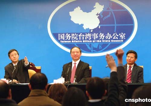 國臺辦一月十二日在北京舉行新聞發布會,邀請國務院臺灣事務辦公室經濟局局長何世忠(中)、海峽兩岸航空運輸交流委員會副理事長浦照洲(右一)就臺商春節包機問題回答記者提問。作者:滿會喬