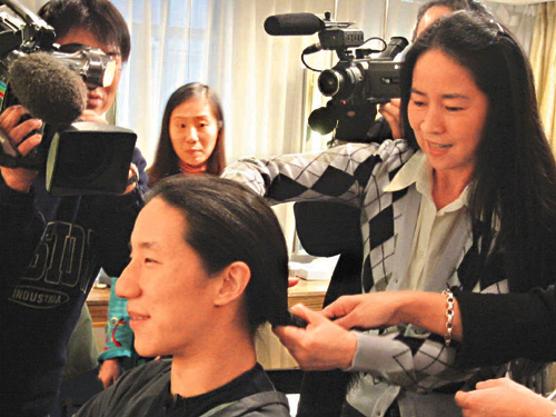 林鳳嬌一貫主張男生要剪短頭發,因此早年一頭長發的成龍換成了一頭短發,雖然“龍大哥”多次在公開場合表示自己喜歡長發,不過這個宿愿只能留給兒子房祖名了。但是林鳳嬌依然不依不饒,去年發了專輯又拍了電影的“龍子”成績不俗,不過一頭長發辮依然讓林鳳嬌有點“不爽”,所以敦促房祖名剪短發。而前往泰國訪問了海嘯災區的房祖名目睹生死慘狀,也決心換一個新形象給歌迷多一些鼓勵,以后無論出現在專輯封面還是時裝電影中,“龍子”都將以短發示人。雖然決心換形象,不過畢竟有些舍不得多年留下的頭發,林鳳嬌也把剪下的頭發保存,算是兒子成長的一個紀念。對自己的新形象,房祖名覺得很不錯,清爽簡單也蠻帥氣,更重要的是能給小歌迷更健康的印象。(記者 劉嵩)