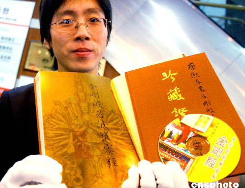 一名工作人員在蘇州展示中國國內首部《金剛經》金書及光碟。堪稱“中華第一金書”的中國首部黃金版《金剛般若波羅密經》(簡稱《金剛經》),1月11日首次在蘇州市新華書店亮相,共發售56套,每套售價19600元人民幣。作者:王建中