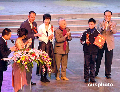 第七屆中國長春電影節(jié)一月十二日晚在長春落幕,年僅十六歲的鐘秋(右二)因在《我的法蘭西歲月》中成功飾演少年鄧小平一角,而獲得“新銳人物獎”。作者:吳兆飛