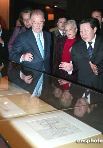 《葡萄牙覓見中國》展覽一月十三日在北京開幕,葡萄牙總統桑帕約(左二)在中國文化部長孫家正(右一)陪同下參觀展出的中國古觀象臺圖紙。作者:滿會喬