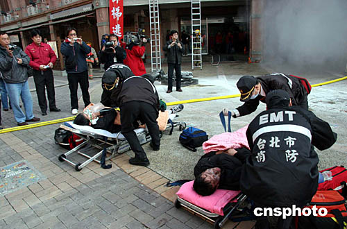 如果沒有各路媒體記者舉著“長槍短炮”從容地走來走去,沒有小小的人群悠閑地觀望,這種場面真會讓人以為一場火災(zāi)正在發(fā)生。其實,“臺北年貨大街”就在這場演習(xí)中拉開序幕了。