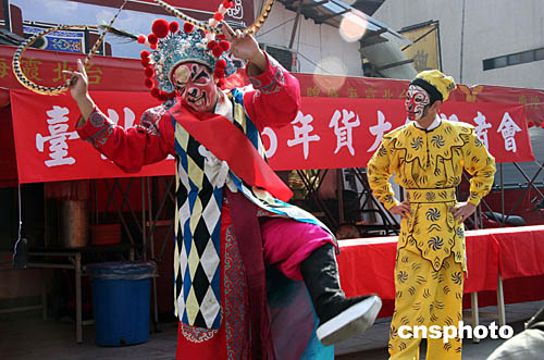 此刻街面上的清凈也絲毫沒有影響媒體記者的熱情,“二00五臺北年貨大街開幕記者會”就在消防演習(xí)后在城隍廟前隆重召開了。裝扮成美猴王、雞王的演員亮麗出場,分別代表去年和新年的“值年星君”授綬帶、傳金寶進(jìn)行交接。一群幼兒園的孩子被這場小演出吸引,拉著老師和猴王、雞王合影,并爭相摸起元寶。閃光燈瞬時四起,捕捉著這些孩子天真可愛的笑容。