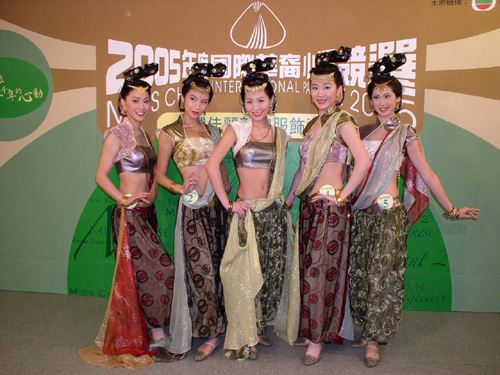 第一組的佳麗分別是1至5號,她們以敦煌造型亮相,為配合飛天意境,她們要被吊到半空?,幸好每個人都不害怕,而且覺得被吊到四米高度也覺好玩。來自悉尼的1號陳慧玲,穿著性感的敦煌舞衣,覺得好冷,她表示前日她們已開始彩排,雖然被扯住腰肢雖然很辛苦但也覺好玩。
