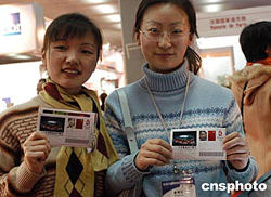 兩名北京女青年一月二十日上午來到北京國貿中心展館,在“第三屆北京國際體育基礎設施和場館技術展覽會”金牛直通自助售票機前,各自模擬定購了附有自己快照的2008年(8月8日20:00時)北京奧運會開幕式----國家體育館漂亮的觀眾票,模擬票價在千元以上不等。此次展會匯聚了國內外眾多著名電子服務和場館技術企業。中新社記者:鄒憲