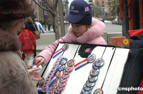 當?shù)貢r間1月20日,在布什就職典禮會場外,小商販兜售帶有布什頭像的紀念章,頗為搶手。作者:余東暉