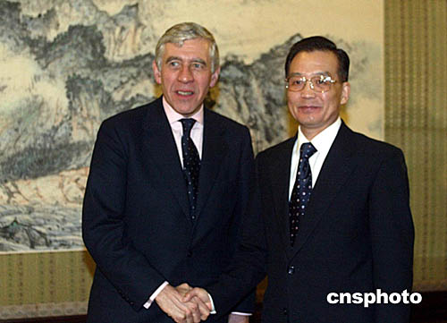 一月二十一日,中國國務院總理溫家寶在北京會見大不列顛及北愛爾蘭聯合王國外交和聯邦事務大臣杰克·斯特勞。中新社記者:廖文靜
