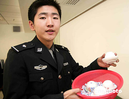 北京警方公布:自去年十二月上旬正式部署查禁賭博專項行動以來,共破獲網(wǎng)絡賭博案件八起,抓獲涉案人員三十六人;還打掉“百家樂”、“六合彩”、“皇帝公司賭”、“扎金花”等傳統(tǒng)聚眾賭博窩點五十七個,抓獲賭博人員六千五百三十九人,收繳賭博資金三百八十六萬余元人民幣。圖為警員展示部分賭具。作者:劉永生