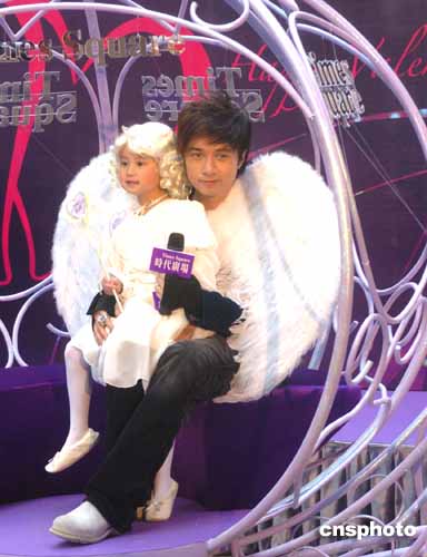 香港歌星古巨基與一小天使25日來到香港時代廣場﹐登上為情人節特別裝飾的“愛神丘比特南瓜車”上﹐傾訴他的深情蜜語﹐迎接情人節的到來。作者:趙振清