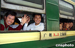 春運拉開帷幕,在廣東中山市打工的外來人員愉快登上廣州開往上海的三五○次春運臨時客車。今年廣州鐵路集團春運期間將安排一百四十二對臨客列車,接送返鄉過年旅客。作者:丁勇
