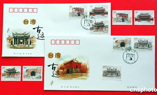 北京市郵票公司為配合國家郵政局于2005年1月30日發行《臺灣古跡》特種郵票(1套5枚),特設計印制了該郵票的首日封(圖)、郵折等郵品,并將與郵票同日發行。《臺灣古跡》特種郵票面值分別是四枚為80分、一枚為1.50元人民幣。郵票名稱分別為“臺北府城北門”、“臺南孔子廟”、“鹿港龍山寺”、“臺南二鯤身炮臺”、“澎湖天后宮”。作者:鄒憲