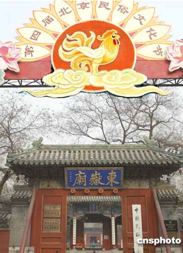 “第四屆北京民俗文化節暨第七屆東岳廟春節文化廟會”將于二月八日至十五日在北京道觀東岳廟舉行,圖為裝飾一新的東岳廟懸掛起“金雞報春”圖。作者:錢興強