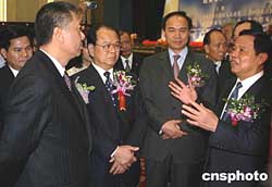 澳門特首何厚鏵一月二十六日訪問廣西,尋求加強合作的新途徑。二00四年,澳門在廣西投資項目共二百八十七個,合同金額二點九四億美元,實際投資金額二點六五億美元,在投資廣西的國家和地區中,澳門的合同金額和實際投資金額均排第八位。圖為廣西自治區政府主席陸兵(右一)在向何厚鏵先生介紹情況。作者:蔣雪林