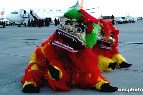 圖:北京舞獅表演為大陸民航首飛臺(tái)灣助興