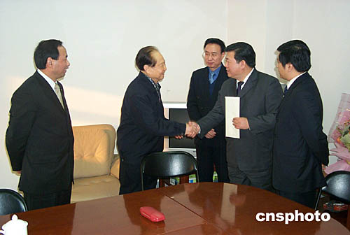 海協會長汪道涵(左二)在上海委托其個人代表孫亞夫(右二)和李亞飛(中)赴臺悼念已故的海基會會長辜振甫。作者:葛鳳章