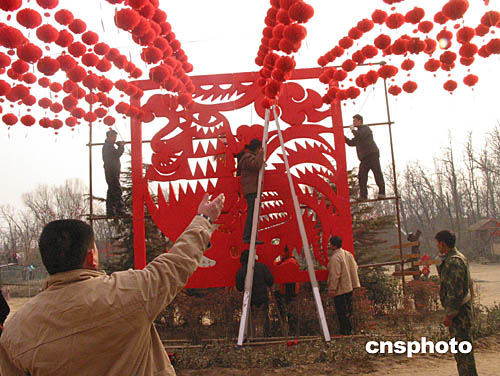 二月一日,一幅直徑四米的中國剪紙《吉祥如意圖》在河南鄭州搭建完畢。這是為2005春節商城民俗文化廟會主會場而建。該剪紙根據中國傳統剪紙技法、經過三天的時間精心設計制作出來的,在歷年同類廟會中,該圖最大。春節廟會結束后將申請吉尼斯世界記錄。作者:慎重