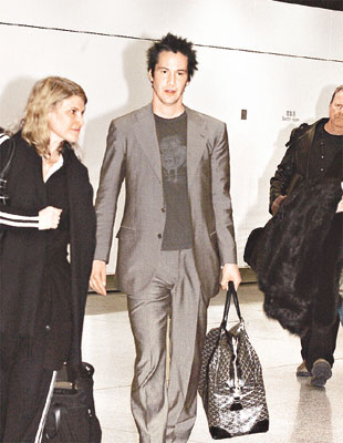 乘坐十多小時機程的基努出閘時略帶倦容,不過仍很友善的向Fans揮手,并上前合照簽名,期間記者蜂擁而上爭相拍照,場面一度混亂,更有女Fans只顧追星連手袋掉在地上也不理。問基努對今次行程有何期望,他說:“希望是一個開心愉快旅程!今次是第一次來香港!”其后他登車往下榻的灣仔君悅酒店,據知酒店方面特別安排了七架專車接送,派頭十足。