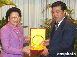 外交部駐港特派員楊文昌(右)2月3日在香港外交部駐港公署接受全國(guó)政協(xié)常委﹑中國(guó)光彩事業(yè)促進(jìn)會(huì)副會(huì)長(zhǎng)張永珍博士向外交部扶貧辦公室捐款40萬(wàn)元港幣﹐在捐贈(zèng)儀式上楊文昌特派員向張永珍博士贈(zèng)送紀(jì)念品。