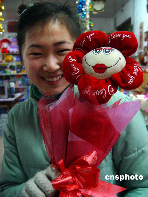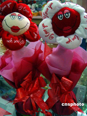 2月13日,在仙居縣一禮品商場,女青年在挑選“會說話”的“電動玫瑰”。這種用布娃造型的玫瑰,內安裝了馬達和發聲器,輕搖“玫瑰”會發出“我愛你”之類的聲響!扒槿斯潯鼻跋,商家挖空心思、別出心裁推出“會說話”的電動玫瑰,深受青年朋友喜愛。作者:華文武