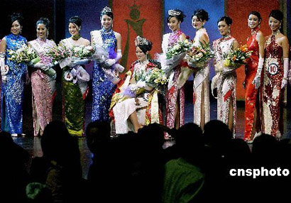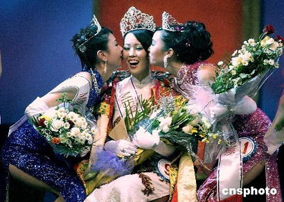 當(dāng)?shù)貢r(shí)間二月十一日,第四十八屆全美華埠小姐競選在加州舊金山舉行。現(xiàn)年二十二歲、自達(dá)拉斯市的福建籍女孩陳盈璉(圖一,中)當(dāng)選二00五年全美華埠小姐。圖二為當(dāng)選中華總商會(huì)小姐的王曉玲(右)和當(dāng)選舊金山華埠小姐的王穎(左)親吻陳盈璉表示祝賀。 作者:陳鋼