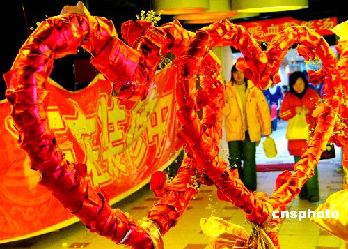 2月13日,一些消費者從南京某商場用“心”打造的通道旁走過。當天是情人節前夜,南京的商場、花店和街頭處處彌漫著浪漫的氣息,商家們都在別出心裁地用“心”打造情人節市場。 作者:王新