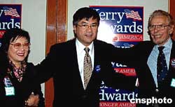 2004年10月13日,美國第一位華裔州長、華盛頓州州長駱家輝(中)前往紐約華埠,為民主黨總統候選人克里爭取亞裔選票。作者:趙海燕