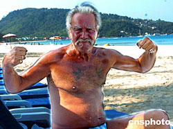 在一處海灘旅游景點上,一位老年游客展示其健壯身軀,表達海灘旅游的熱趣。海嘯地震過后,布吉島當地相關方面積極刺激旅游業發展,目前游客人數日益增多,往日的繁榮正在逐步復蘇。作者:宋吉河