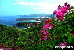 2月中旬的泰國布吉島三海風光旅游區,風和日歷,絢麗的山花映襯著碧藍的大海,展現出一幅美麗畫卷。