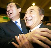 中新網2月24日電 據臺灣媒體報道,國民黨主席連戰夫婦昨晚返回臺灣,約有近四十名“立委”及七十名黨部人員前往接機,黨主席熱門人選的“立法院長”王金平、臺北市長馬英九都提早在機場等待,親民黨則派出秘書長秦金生、“立院”黨團總召集人劉文雄到場接機,王馬兩人還多次互相擁抱,展現團結氣氛。
