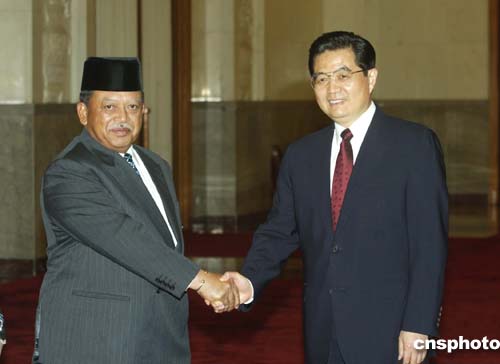 中新社北京二月二十八日電 (記者 朱大強)中國國家主席胡錦濤今天在人民大會堂會見了馬來西亞最高元首西拉杰丁。