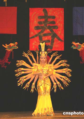 中國殘疾人藝術團二月二十七日在巴黎近郊賽日市舉行的“中國日”活動中,表演舞蹈“千手觀音”。該節目亦將在二十八日舉行的“世界殘疾成果及發獎大會”上演出。圖為著名殘疾人舞蹈家邰麗華領銜為當地法國觀眾和華僑表演。作者:鐘誠