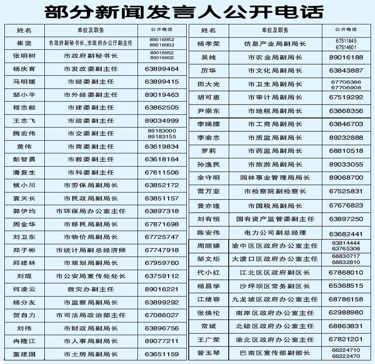 據介紹,重慶市如今共有140位政府新聞發言人。此次公布的,包括市政府、60個市級政府部門以及40個區(市)縣政府的新聞發言人的公開電話。