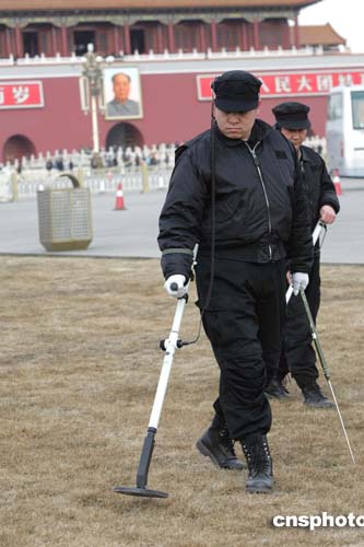 全國政協十屆三次會議三月三日下午三點在北京人民大會堂隆重開幕,會議開始前,警員對天安門廣場進行安全檢查。作者:毛建軍