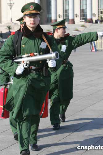 十屆全國人大三次會議三月四日在北京人民大會堂舉行預備會議,武警消防官兵在天安門廣場例行巡視,確保大會順利進行。作者:湯彥俊