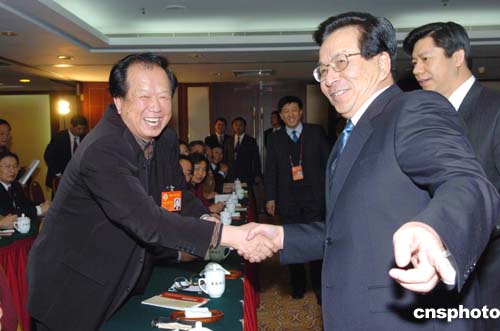三月四日,中共中央政治局常委、國家副主席曾慶紅到北京華潤飯店參加全國政協民進、民盟聯組會議時,應著名導演李前寬的要求與其握手。作者:陳文