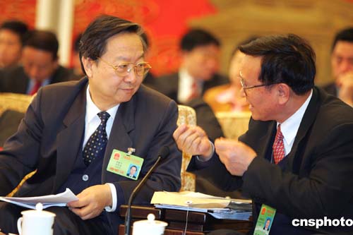 國(guó)家安全生產(chǎn)監(jiān)督管理總局局長(zhǎng)李毅中(左),三月七日到全國(guó)人大遼寧代表團(tuán)參加審議政府工作報(bào)告,聽(tīng)取該團(tuán)代表關(guān)于安全生產(chǎn)問(wèn)題的發(fā)言。作者:湯彥俊