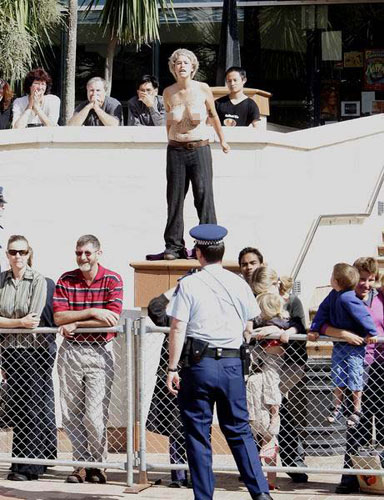 查爾斯王子在人群中間走來走去的時候,一名當地婦女突然脫下上衣,露出胸部所寫的一行字:“把殖民地的恥辱從我乳房上移走”。先前不久,即查爾斯王子抵達新西蘭之后不久,就有一名懷抱孩子的婦女當眾露胸,表示對查爾斯的抗議。該婦女很快就被警察帶走,目前已經以擾亂社會秩序罪遭到起訴。