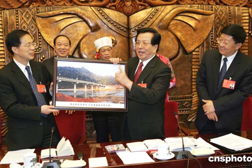 中共中央政治局常委、國家副主席曾慶紅三月九日下午與云南代表一起審議大會報告時,接受代表贈送的遮坎大橋重建后的照片,并回憶起二00四年七月德宏傣族景頗族自治州受災的情景。曾慶紅曾于當時視察災區。作者:毛建軍