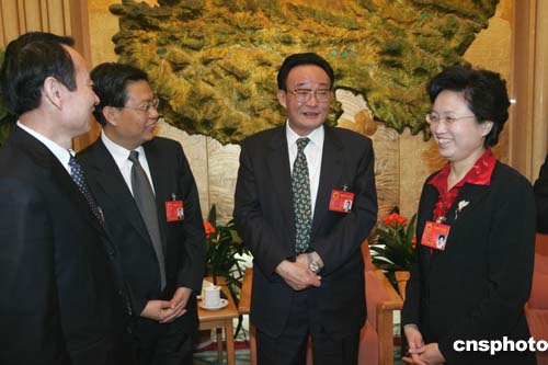 中共中央政治局常委、全國(guó)人大常委會(huì)委員長(zhǎng)吳邦國(guó)三月九日下午與青海代表一起審議全國(guó)人大常委會(huì)工作報(bào)告與“兩高”報(bào)告。圖為吳邦國(guó)委員長(zhǎng)與青海省委書記趙樂際(左二)、青海省省長(zhǎng)宋秀巖(右一)一起交換有關(guān)西部發(fā)展的意見。作者:毛建軍