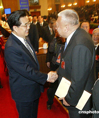 三月十二日,全國政協十屆三次會議在北京閉幕,大會表決通過了增選董建華為全國政協副主席。國家主席胡錦濤向董建華表示祝賀。作者:廖文靜