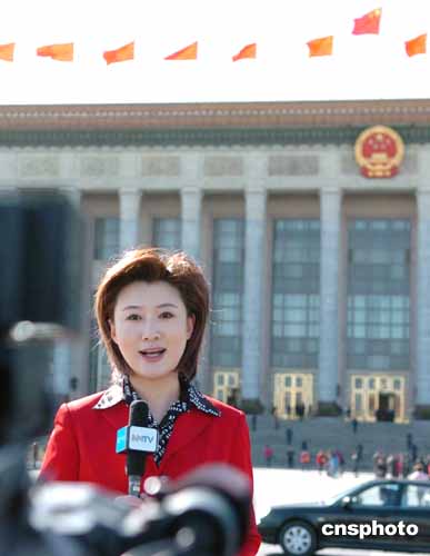 三月十二日下午,內蒙古電視臺主持人李琳在北京人民大會堂外現場報道全國政協十屆三次會議閉幕大會。作者:陳文