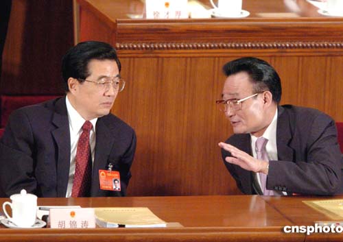 十屆全國人大三次會議第四次全體大會三月十三日上午在北京人民大會堂舉行,投票選舉中華人民共和國中央軍事委員會主席。圖為胡錦濤與吳邦國在主席臺上交談。作者:陳文