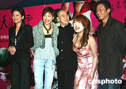 榮獲柏林電影節銀熊獎的臺灣電影《天邊一朵云》在全臺公映。該片因有暴露的性愛鏡頭而引起一些爭議。圖為3月18日晚,臺灣著名導演蔡明亮(中)與該片主要演員出席在臺北舉行的首映式。作者:董會峰