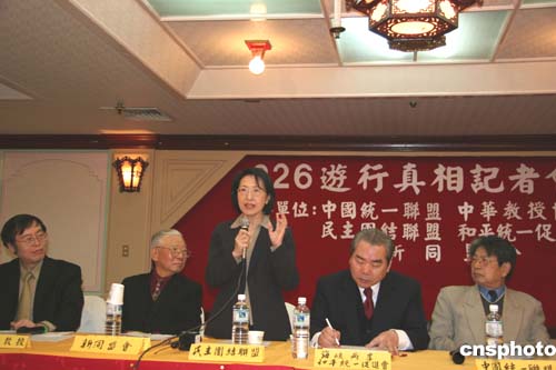 中新社臺北三月二十日電(記者 趙江濤 董會峰)中國統一聯盟、中華教授協會、民主團結聯盟、和平統一促進會、新同盟會今天在此間舉行“三二六游行真相聯合記者會”。與會人士指出,以所謂“反‘反分裂法’”、“反并吞”為由發動“三二六”游行,因果倒置、不負責任,對臺灣民眾沒好處,也無益于兩岸關系改善。