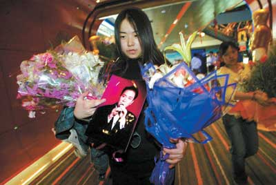 雖然張國榮已經(jīng)離開了近兩年,但是他的影迷卻一直沒有忘記他。昨天,當(dāng)記者來到影片《異度空間》首映式現(xiàn)場時發(fā)現(xiàn),現(xiàn)場已經(jīng)聚集了上百位張國榮的影迷,在影片海報(bào)旁擺滿了他們送來的白玫瑰和白百合,上面還插著“哥哥”的生前照片。而影院也配合播放著張國榮的歌曲,很多歌迷也在小聲地隨著哼唱。
