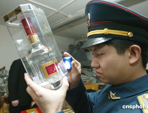 今年頭兩個多月的時間內(nèi),北京工商東城分局共查獲各種名牌假白酒1792瓶,案值12.8萬元人民幣。其中絕大多數(shù)酒瓶和包裝箱均為回收品,特別是部分假冒名牌酒,均使用舊酒瓶及包裝。由于這些假酒使用的是回收舊瓶,普通消費者很難識別。如何銷毀舊酒瓶,杜絕不在回收二次使用,成為打擊假名酒的“關鍵”。圖為東城工商分局執(zhí)法人員在仔細檢查酒瓶的外觀。作者:羅偉
